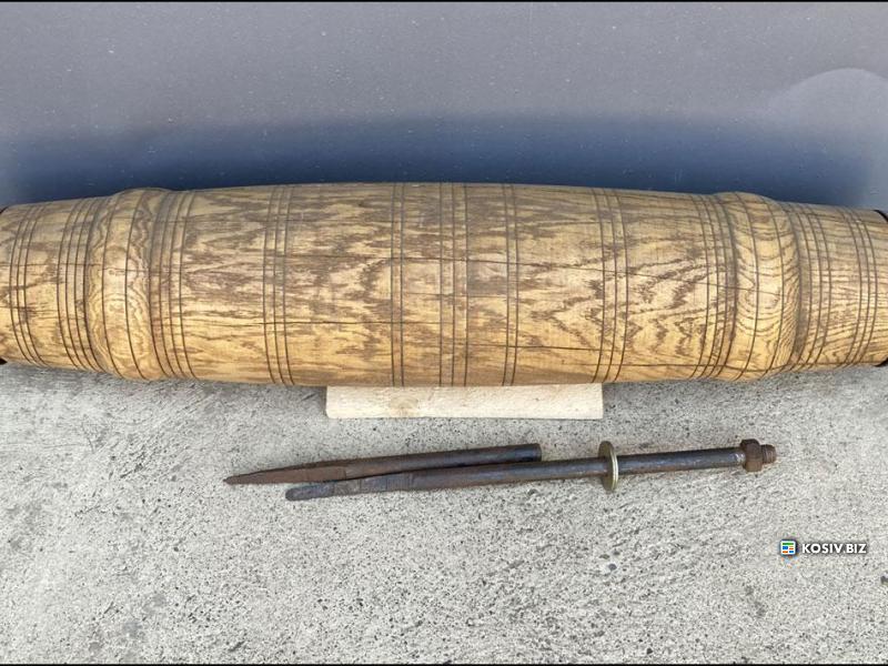 Також продається нова дубова корба з кріпленнями і підшипниками: довжина — 97 см, діаметр — 20 см., а також колесо діаметром 87 см.